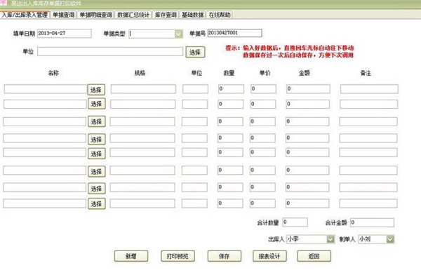 易達(dá)出入庫庫存單據(jù)打印軟件:軟件主要面向企業(yè)單位打印出庫單和入庫單,庫存統(tǒng)計(jì)管理等功能,支持盤點(diǎn)管理,打印入庫單,打印出庫單銷售統(tǒng)計(jì)查詢分析,數(shù)據(jù)導(dǎo)出,商品管理,客戶管理等功能。