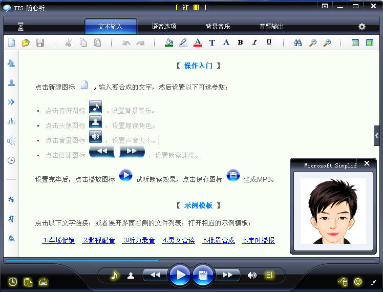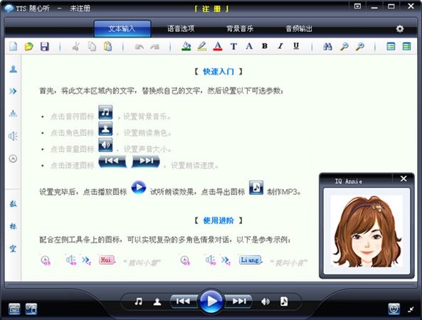 tts隨心聽朗讀或轉換時,可以對語速、音調、音量、音質進行整體調節(jié),也可以對每個文字進行單獨調節(jié),還可以添加任意背景音樂。此外,程序還支持語音報時、語音校對、定時播報、朗讀網頁以及其它任意選中的文字。