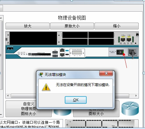出現(xiàn)下面這個(gè)情況表示紅色箭頭位置開(kāi)關(guān)沒(méi)有關(guān)。設(shè)備是模擬不能熱插拔的。記得安裝上模塊了之后要打開(kāi)電源。