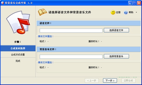 選擇語音文件及希望添加的背景音樂文件,目前“背景音樂合成專家”可支持MP3及波形(WAV)兩種格式的媒體文件。