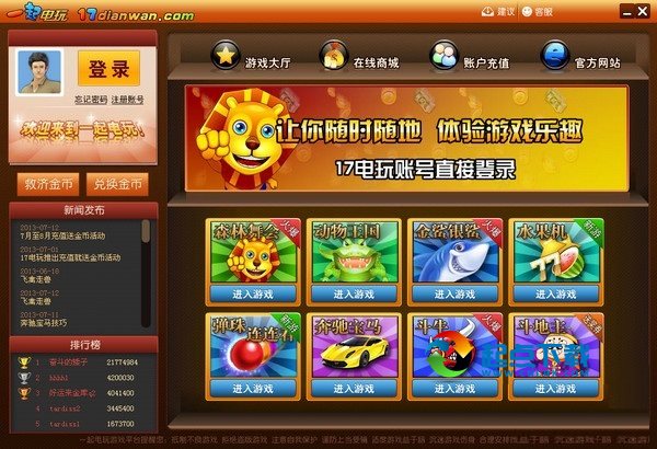 一起電玩集于一體的網絡游戲!讓您在休閑娛樂的同時展示自己無限魅力于網絡,超越了傳統(tǒng)街機的枯燥乏味。在這里,您可以在家里就能玩游戲廳的游戲,捕魚達人,森林舞會,3D動物王國,森林舞會網絡版,飛禽走獸游戲,萬能鯊魚大白鯊,金鯊銀鯊,奔馳寶馬,老虎水果機、牛牛、斗地主多款街機游戲總有一款適合您。還等什么快來17電玩游戲吧。(可以兌換實物獎品)