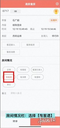 4、依據(jù)房間的實(shí)際狀況,要是發(fā)現(xiàn)有客人遺留的物品,需選擇“有客遺”選項(xiàng),且迅速提交查房信息。