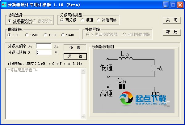 軟件開始運(yùn)行時(shí)定位在二分頻 6dB/Oct 的位置,首先計(jì)算低通數(shù)值。而當(dāng)選擇帶通時(shí),首先計(jì)算高通數(shù)值。計(jì)算后的結(jié)果直接列于屏幕上。
