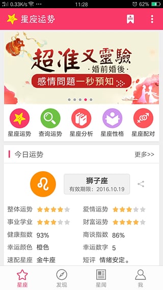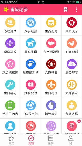 【運勢】今日運勢,明日運勢,本周運勢,本月運勢,今年運勢,愛情運勢,整體運勢,財富運勢,幸運顏色,幸運數(shù)字,健康指數(shù);【發(fā)現(xiàn)】心理測試,歷史星座運勢,星座查詢,星座詳解,星座配對,生肖配對,星座生肖解讀,血型配對,生日密碼,生日花語,號碼吉兇,指紋評測,九型人格,氣質(zhì)類型,老黃歷,歷史上的今天,讀心術(shù),看你有多“色”,記憶方塊,舒爾特方塊;