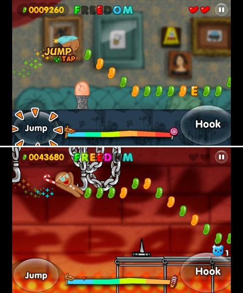 姜餅人大逃亡 OvenBreak的操作以屏幕下方左右兩側(cè)的虛擬按鈕為主,左邊為跳躍,右邊為滑行,而憑借物體的支撐,你也可以先按跳躍再按滑行實(shí)現(xiàn)蕩跳的效果。姜餅人大逃亡游戲過(guò)程中,你需要吃一路上的糖豆和字母,普通糖豆可增加得分,收集的字母組成“FREEDOM”便可獲得意外生命或分?jǐn)?shù)獎(jiǎng)勵(lì),拾取特殊糖豆可一次獲得2000高分。