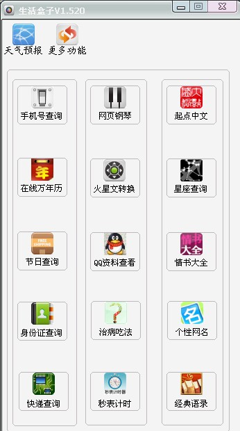 生活盒子以方便生活查詢?yōu)橹?,主要有天氣查詢(詳?xì)參數(shù)、詳細(xì)地址)、快遞查詢、手機(jī)號(hào)歸屬地查詢、情書大全、秒表計(jì)時(shí)、倒計(jì)時(shí)、網(wǎng)頁鋼琴等功能。