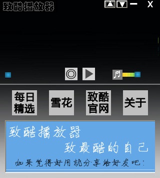 致酷播放器 v1.1 綠色免費版 致酷播放器由致酷網(wǎng)開發(fā)并發(fā)布的一款簡潔炫酷的音樂播放器,雖然界面小巧卻非常強勁。更有飄雪桌面動畫,讓你在享受音樂的同時不再單調。