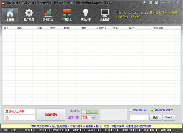天使QQ掛號器是一款可掛常用IP并且可掛等級的多功能掛號工具,qq掛號器測試版本除了掛號數(shù)量有限制外,其他功能都沒有限制,穩(wěn)定、高效,歡迎下載使用。
