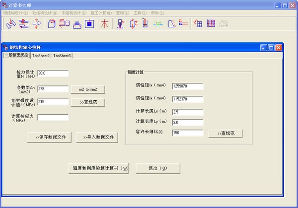 該軟件具備結(jié)構(gòu)設(shè)計(jì)、施工相關(guān)計(jì)算功能,包括:混凝土偏心受壓柱的自動(dòng)配筋計(jì)算并生成word計(jì)算書,纜索吊裝計(jì)算并自動(dòng)生成word計(jì)算書,鋼材壓桿穩(wěn)定計(jì)算并生成word計(jì)算書,砼沖切承載力計(jì)算并生成word計(jì)算書,砼局部承壓計(jì)算并生成word計(jì)算書,噴射砼攪拌站基礎(chǔ)計(jì)算并生成word計(jì)算書,隧道通風(fēng)計(jì)算,單樁(摩擦樁、柱樁)軸向承載力計(jì)算,擋土墻計(jì)算,普通梁配筋計(jì)算,風(fēng)荷載計(jì)算,工字鋼抗拉、彎、剪自動(dòng)計(jì)算,角焊縫計(jì)算,線性內(nèi)插計(jì)算,材料體積面積計(jì)算、截面特性計(jì)算等等,對(duì)部分規(guī)范中參數(shù)采用數(shù)據(jù)庫自動(dòng)查詢的辦法,比如不同類型截面的鋼材受壓穩(wěn)定系數(shù)查表,砼受壓柱受壓穩(wěn)定系數(shù)查表,砼彈性模量,抗拉設(shè)計(jì)強(qiáng)度、抗壓設(shè)計(jì)強(qiáng)度查表等等,省去了查詢相關(guān)規(guī)范和書籍的麻煩,對(duì)工程技術(shù)人員來講CSM軟件是很好的幫手,“計(jì)算書大師軟件”對(duì)結(jié)構(gòu)設(shè)計(jì)人員、施工技術(shù)人員快速化決策提供有力的技術(shù)支撐。