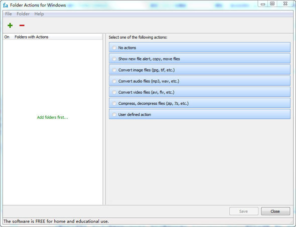 1、設(shè)置的方法很簡單,首先添加需要智能化的文件夾,然后設(shè)置相應(yīng)的操作。Folder Actions for Windows 提供包括提醒、復(fù)制、移動、文件重命名,圖片、音頻、視頻文件的格式轉(zhuǎn)換,文件壓縮等等的操作,設(shè)置好對應(yīng)的操作點擊保存即可。