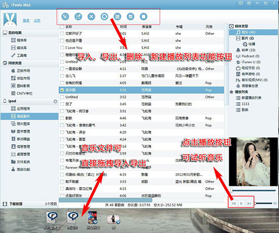 點(diǎn)擊“音樂”,直接拖拽音樂進(jìn)行導(dǎo)出導(dǎo)入。點(diǎn)擊【新建列表】,可以把音樂按個(gè)人喜好歸類。點(diǎn)擊界面右下角【播放】按鈕,可以直接試聽音樂。
