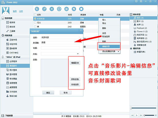 選擇音樂右擊可以給音樂添加封面歌詞。(PS:設(shè)備上直接添加歌詞僅支持iOS6系統(tǒng),其他系統(tǒng)可在”我的電腦-媒體庫(kù)”批量添加封面歌詞。)