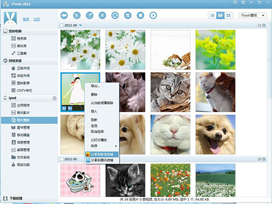 點(diǎn)擊【照片圖庫(kù)】,iTools會(huì)顯示所有照片壁紙,你可以直接對(duì)所有照片導(dǎo)出、導(dǎo)入、刪除、歸類,也可以用iTools預(yù)覽照片、分享到微博。相機(jī)膠卷相機(jī)膠卷導(dǎo)入時(shí),需要安裝并打開應(yīng)用兔才能可以。