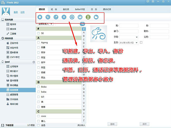 點(diǎn)擊【信息管理】,可以對(duì)通訊錄、短信、備忘錄、書簽、日歷、通話記錄進(jìn)行新建、導(dǎo)出、導(dǎo)入、備份等操作。