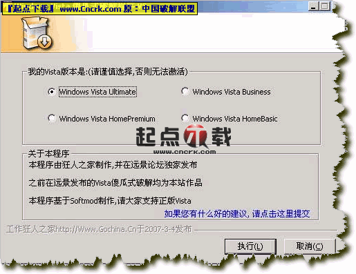 基于Softmod的Windows Vista傻瓜工具,在Vista下即右鍵點擊此程序,選擇“在管理員模式下運行”,按提示選擇正確的版本后,點“執(zhí)行”自動導(dǎo)入授權(quán)證書,自動更換序列號,自動安裝SoftMod補丁,重啟后即可進(jìn)行激活.
