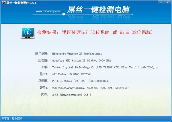 屌絲一鍵檢測硬件常簡單的電腦硬件檢測軟件,只需一鍵,輕松完成,想知道自已的電腦是什么處理器、主板、顯卡及顯示器或者多大硬盤么,這款工具可以一鍵幫你完成。
