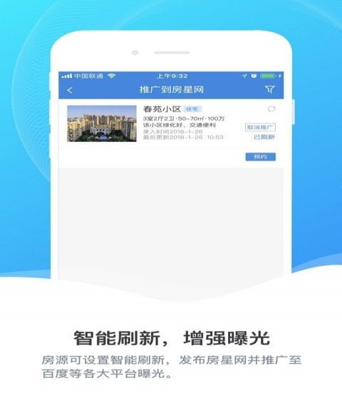 房源可設(shè)置智能刷新,發(fā)布房星網(wǎng)并推廣至百度等各大平臺曝光。