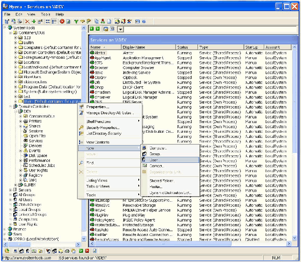 SystemTools Hyena是一個相當(dāng)強大的Windows NT 2000/2003以及XP的管理工具,完全替代Windows自帶工具。可以對于用戶,用戶組(本地以及網(wǎng)絡(luò)),共享,域名,電腦主機,設(shè)備,事件,文件,打印機(打印作業(yè)),硬盤空間,用戶權(quán)限,計劃任務(wù),進程等等眾多項目進行周到的管理。