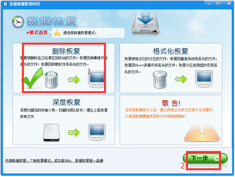 2.選擇數(shù)據(jù)恢復(fù)模式,根據(jù)個人實(shí)際情況(在這里我們假設(shè)不小心刪除的是D盤下文件 并已經(jīng)清空回收站。)選擇刪除恢復(fù),并單擊下一步。