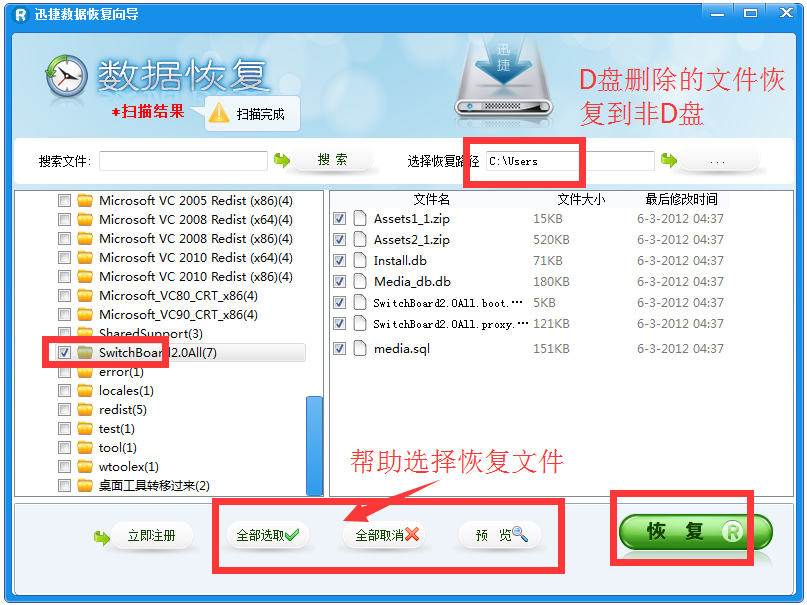 注意:恢復(fù)路徑不能是丟失文件的分區(qū),如D盤被格式化則千萬不能選擇D盤為恢復(fù)路徑?。?br />