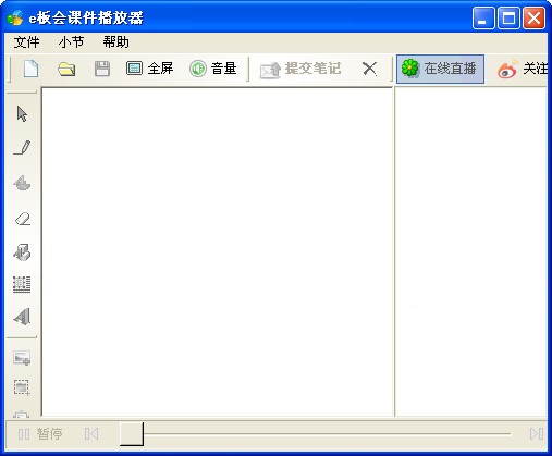 2、功能欄:包含新建文件、打開文件、另存為文件、全屏播放、音量調(diào)控、提交筆記和刪除筆記、在線直播、關(guān)注e板會新浪微博等選項。