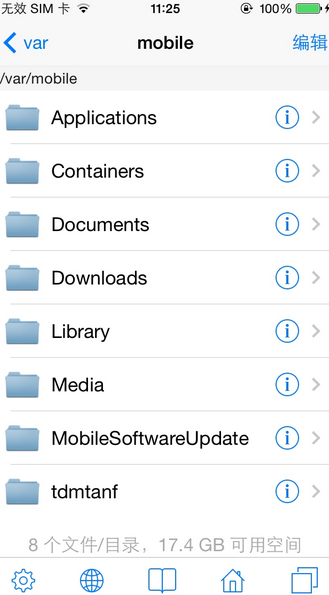 目錄操作電腦系統(tǒng)和手機(jī)系統(tǒng)都一樣包含了文件系統(tǒng),而文件系統(tǒng)中會用目錄來管理系統(tǒng)中的文件,不同的文件存放在不同的目錄中。有時候當(dāng)我們需要修改設(shè)備上的一些文件時,就必須進(jìn)入到文件所在的目錄,然后找到文件才可以修改它。打開軟件以后,默認(rèn)會在系統(tǒng)的 /var/moblie 目錄下,如圖所示