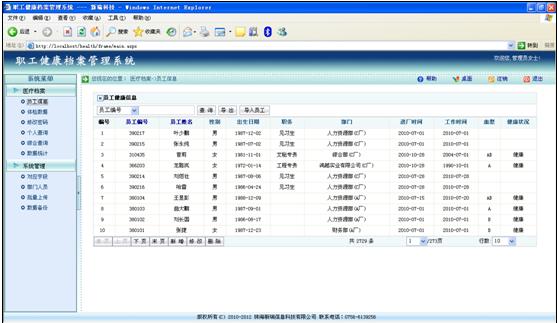 系統(tǒng)提供了功能強大的模板導入功能,方便對每次員工集中體檢后大量數(shù)據(jù)的批量錄入。為方便個人信息查詢,系統(tǒng)提供了不可逆加密和首次登錄修改密碼的使用措施,所有訪問登錄都有日志記錄,通過這些手段來提高信息安全性和保密性。同時系統(tǒng)提供了靈活的查詢和圖表統(tǒng)計功能,為管理員全面掌握企業(yè)員工健康狀況提供依據(jù)。【軟件特點】