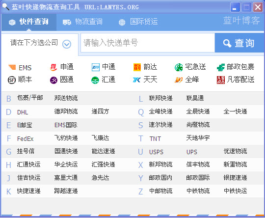 藍(lán)葉快遞物流查詢工具是一款用于查詢快遞和物流的軟件,快遞物流查詢工具支持十多家快遞和物流公司的包裹查詢,軟件綠色小巧,功能強(qiáng)大。實(shí)用的小工具,非常方便。