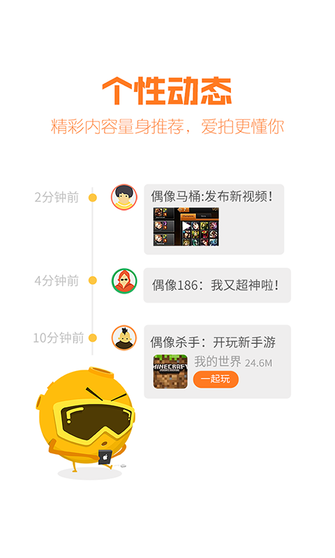 愛(ài)拍原創(chuàng)安卓版里聚集了海量原創(chuàng)視頻及一大批視頻創(chuàng)作達(dá)人和草根明星紅人,覆蓋游戲視頻、競(jìng)技解說(shuō)、美女主播、才藝表演、動(dòng)漫手繪、生活時(shí)尚、翻唱潮舞、吐槽惡搞、脫口秀、微電影、娛樂(lè)搞笑等領(lǐng)域,形成了一個(gè)百家爭(zhēng)鳴、氛圍活躍、獎(jiǎng)勵(lì)增值多多、積極展露個(gè)人風(fēng)采/創(chuàng)造自我價(jià)值的良性創(chuàng)作生態(tài)圈,是年輕人的原創(chuàng)娛樂(lè)首選地!