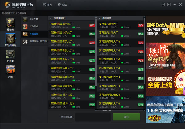 2、然后選擇您要玩的游戲類別,分為魔獸類別、即時戰(zhàn)略類、射擊類和其他。我以魔獸爭霸3為例講解。選擇【魔獸類】-【魔獸對戰(zhàn)】,選一個服務(wù)器。然后點(diǎn)擊【確認(rèn)】。