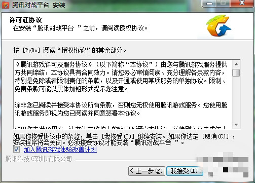 2、點(diǎn)擊下一步,閱讀并接受QQ對戰(zhàn)平臺許可協(xié)議,還可選擇是否加入騰訊游戲體驗(yàn)改善計(jì)劃。