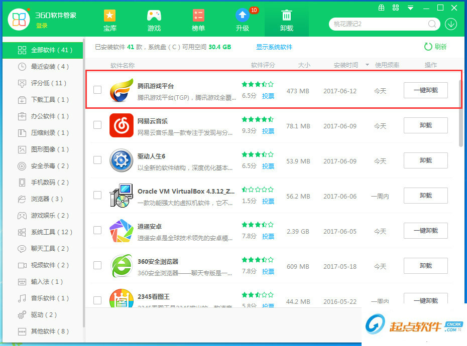 2、然后在管家的“卸載”界面中找到“騰訊游戲平臺”,之后點(diǎn)擊卸載并根據(jù)提示操作即可將其卸載。