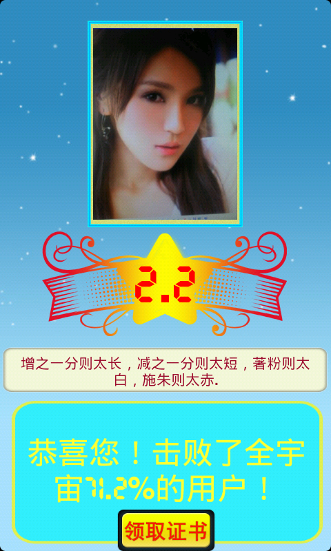 美丑照相機(jī) 2.2.8 安卓版 美丑相機(jī)是一款計(jì)算個(gè)人長(zhǎng)相的手機(jī)娛樂(lè)應(yīng)用。想知道自己的長(zhǎng)相到底如何?感覺(jué)對(duì)方不如你帥/美他/她確不肯承認(rèn)?美丑照相機(jī)安卓版采取精密的算法,可以計(jì)算出你的長(zhǎng)相。更有pk模式,讓你和朋友們一比高低!帥哥還是青蛙,美女還是恐龍,真相只有一個(gè)!