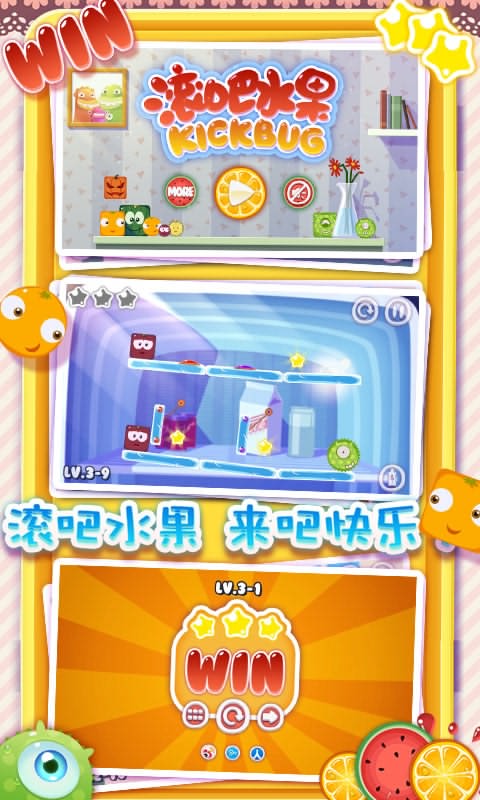 滾吧水果是一款精品物理益智游戲,玩法易懂,操作簡單,過程輕松,少有受挫感,非常適合喜歡輕松游戲的玩家。您只需以手指輕觸水果,讓水果們在“方”和“圓”間轉(zhuǎn)換,以控制它們滾或不滾,通過它們滾動的力量將蟲子趕下平臺,并且最后自身還能安然停留就能過關(guān)!