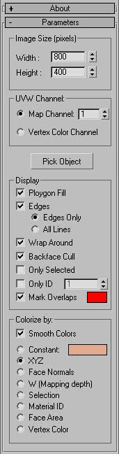 1、 圖象尺寸:這里是規(guī)定輸出的(unwrapped)網(wǎng)格(wireframe)的尺寸,如果想將位圖的紋理做的更細(xì)的話,可以使用更大數(shù)值。如果該3D物體離的很遠(yuǎn),我想800 ×600就可以了。