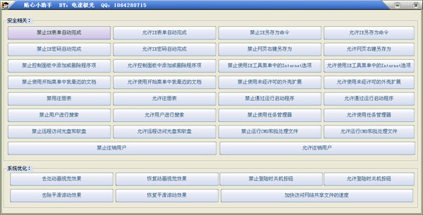 禁止IE表單自動(dòng)完成、禁止IE密碼自動(dòng)完成、進(jìn)制控制面板中添加或刪除程序項(xiàng)、禁用注冊(cè)表、去除動(dòng)畫視覺效果、去除平滑滾動(dòng)效果等,詳見軟件的主界面。