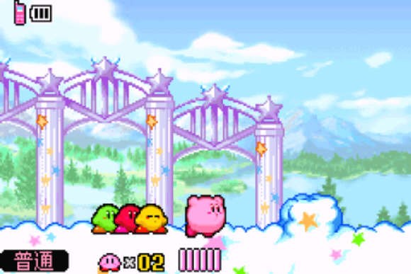 A鍵為跳,再按一下就會(huì)含一口氣在肚子里,可以飛起來(lái)。從高處(2/3個(gè)屏幕高)掉下來(lái),就會(huì)大頭朝下落,這樣也是有攻擊力的。在肚子鼓起來(lái)的時(shí)候按B鍵是吐氣,有攻擊力的,攻擊距離很短。在肚子空的時(shí)候按B鍵是吸氣,可以吞掉敵人,就算是有墻隔著的地方也可以吸到。如果是吸到有特殊能力的敵人,按一下十字鍵的下鍵就可以復(fù)制敵人的能力。吸入兩個(gè)敵人再按下鍵,就可以用輪盤選擇能力,等它自動(dòng)停下來(lái)的話,是大錘能力;吸入兩個(gè)敵人后噴出,噴出的星星有穿透效果。(如果將星星和敵人同時(shí)吸入再使用,則使用星星的能力)如果蹲著按B鍵可以做出滑鏟的動(dòng)作。
