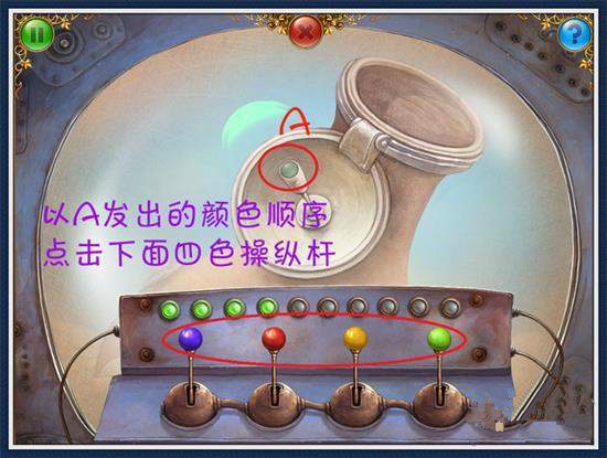 16、回一層,放入管道和齒輪。在右邊機(jī)器處放入燈泡,開(kāi)始謎題。(圖4)點(diǎn)擊操作桿和左下方的紅色按鈕,進(jìn)入。