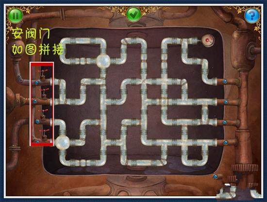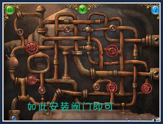 4、上來(lái)后繼續(xù)向左一步,找到5個(gè)拼圖片。點(diǎn)擊左邊機(jī)器上的蓋子。下方找到閥門1個(gè)。5、右走一步,找到閥門1個(gè)。打開(kāi)中間窗子,放入燒瓶,組裝機(jī)器(圖10、11)拿走電池。