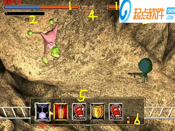 1、金錢數(shù) 2、主角體力 3、四項參數(shù) 4、職業(yè) 5、幫助 6、主角狀態(tài)情況 7、道具 8、地圖 9、系統(tǒng)如存檔、退出游戲等 10、大炮,點擊發(fā)射骰子決定主角步數(shù)。