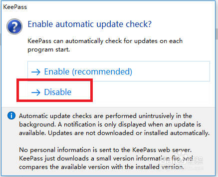 等待安裝完成后點擊finish結束安裝進程,然后啟動程序。第一次會詢問你是不是每次啟動后都要檢查更新,因為keepass是一個開源軟件,更新的速度非???。提醒也很麻煩,所以我選擇了disable,如果你想嘗鮮,則可以選擇enable
