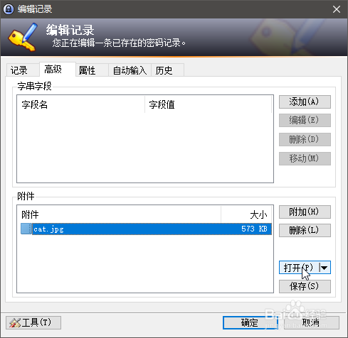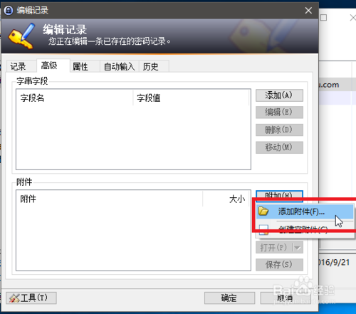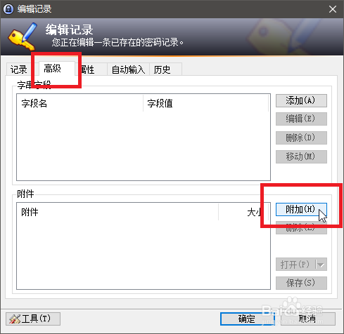 在記錄的賬號條目上右鍵 編輯/查看記錄 ,在彈出的 編輯記錄 窗口,點 高級 ,在附件欄點擊 添加(H) 按鈕