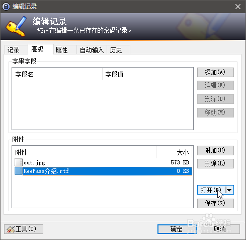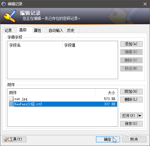 這樣附件就添加成功了。KeePass內置了文件查看器,選擇附件點擊右下 打開 按鈕,就可以查看附件了。