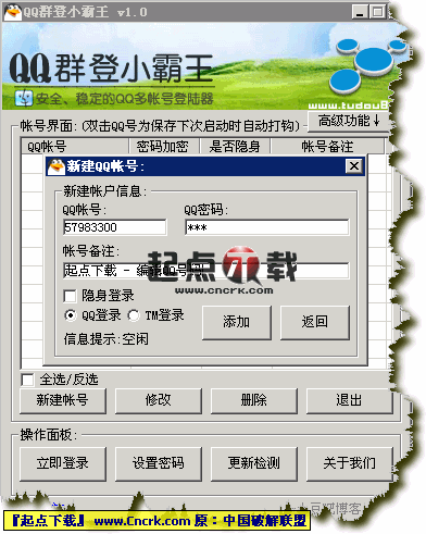 + QQ密碼使用MD加密處理,從新建QQ帳號(hào)信息后你的QQ密碼就已經(jīng)加密處理,可達(dá)到QQ防盜效果!