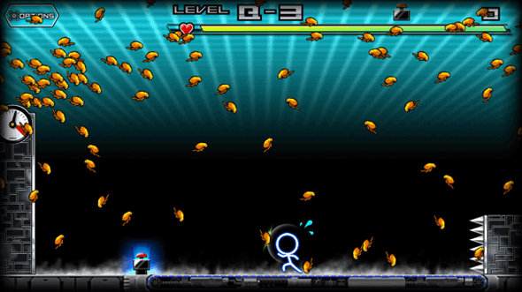 本作提供了虛擬按鍵與區(qū)域觸屏操控兩種模式,經(jīng)過一番試玩筆者還是覺得選用前者能夠得到較為舒心的體驗(yàn)。當(dāng)游戲開始之后,你需要在按下特定的按鍵或區(qū)域來讓小人跑動起來,向后呼呼運(yùn)轉(zhuǎn)的傳送帶以及背后那長滿釘刺的擋板會讓主人公無法停下腳步,當(dāng)然你也就別想著能閑下來了。