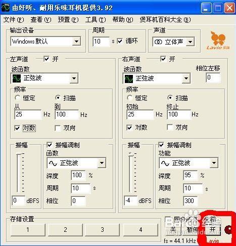 3、首先按照順序設(shè)置低音域設(shè)置,然后點擊開。將耳機插到電腦耳機孔。然后調(diào)整音量大?。ㄒ袅坎灰?,和平時聽歌聲音差不多即可)。另外煲機并不是一個固定值個人可以給你一個建議,就是聽一下該音域聲音是否滿意,不滿意煲機3到4個小時左右,然后再聽聽效果,以此類推等該音域流暢了,再進入下一音域(新耳機煲機要比較久,聲音干澀的話第一階段可以放久一點8個小時左右,然后再間隔試聽)。