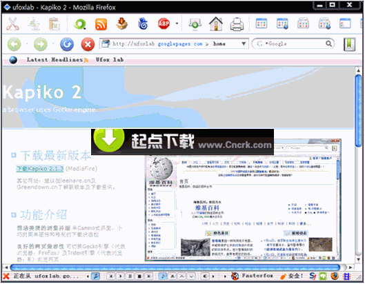 Kapiko(原Convenientfox) V3.0.12 簡體中文綠色免費版 Kapiko是一款基于Firefox的瀏覽器,它基于Firefox 3.0.3(Gecko 1.9.0.3),集成了大量實用擴展,普通電腦用戶絕對值得試試。Kapiko具備良好的網(wǎng)頁兼容性,支持自由切換瀏覽器內(nèi)核;用戶可以在瀏覽器中控制音樂播放;內(nèi)置代理工具,網(wǎng)絡(luò)沖浪無憂;強勁廣告過濾,讓你徹底告別各種廣告;貼心的智能網(wǎng)址糾錯;支持標(biāo)簽頁縮略圖預(yù)覽;內(nèi)置FTP管理器、支持多線程下載……