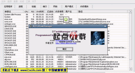 DTaskManager(任務(wù)管理器) V1.51 綠色漢化版 DTaskManager DtaskManager 是一款向標(biāo)準(zhǔn)的 Windows 任務(wù)管理器添加了額外的功能的獨(dú)立的任務(wù)管理器軟件.該軟件提供了進(jìn)程的不同方式,你還可以整理內(nèi)存的使用情況,批量設(shè)置優(yōu)先權(quán),臨時(shí)掛起進(jìn)程,監(jiān)視端口活動(dòng),隱藏窗口等等.該軟件的操作界面非常類(lèi)似于 Windows 版本,并且可以隨意地設(shè)置替換