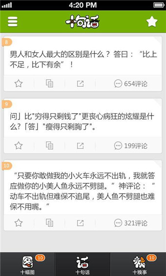 1)精挑細選:10條!每天每類只有10條!每一條上榜的段子圖片糗事都經(jīng)歷了嚴(yán)酷的生存考驗!