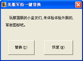 玩膩國服的小朋友們,來體驗體驗外服的軍銜圖標吧,cf散人美服軍銜一鍵替換工具可以幫助玩家們把自己的軍銜圖標替換成美服的,歡迎下載體驗吧。